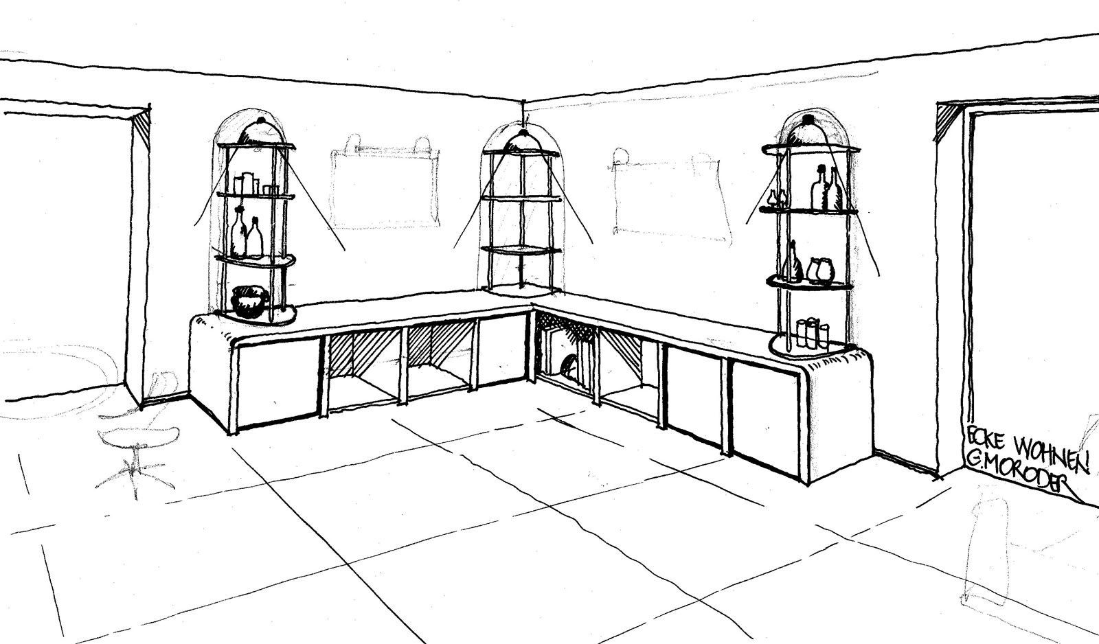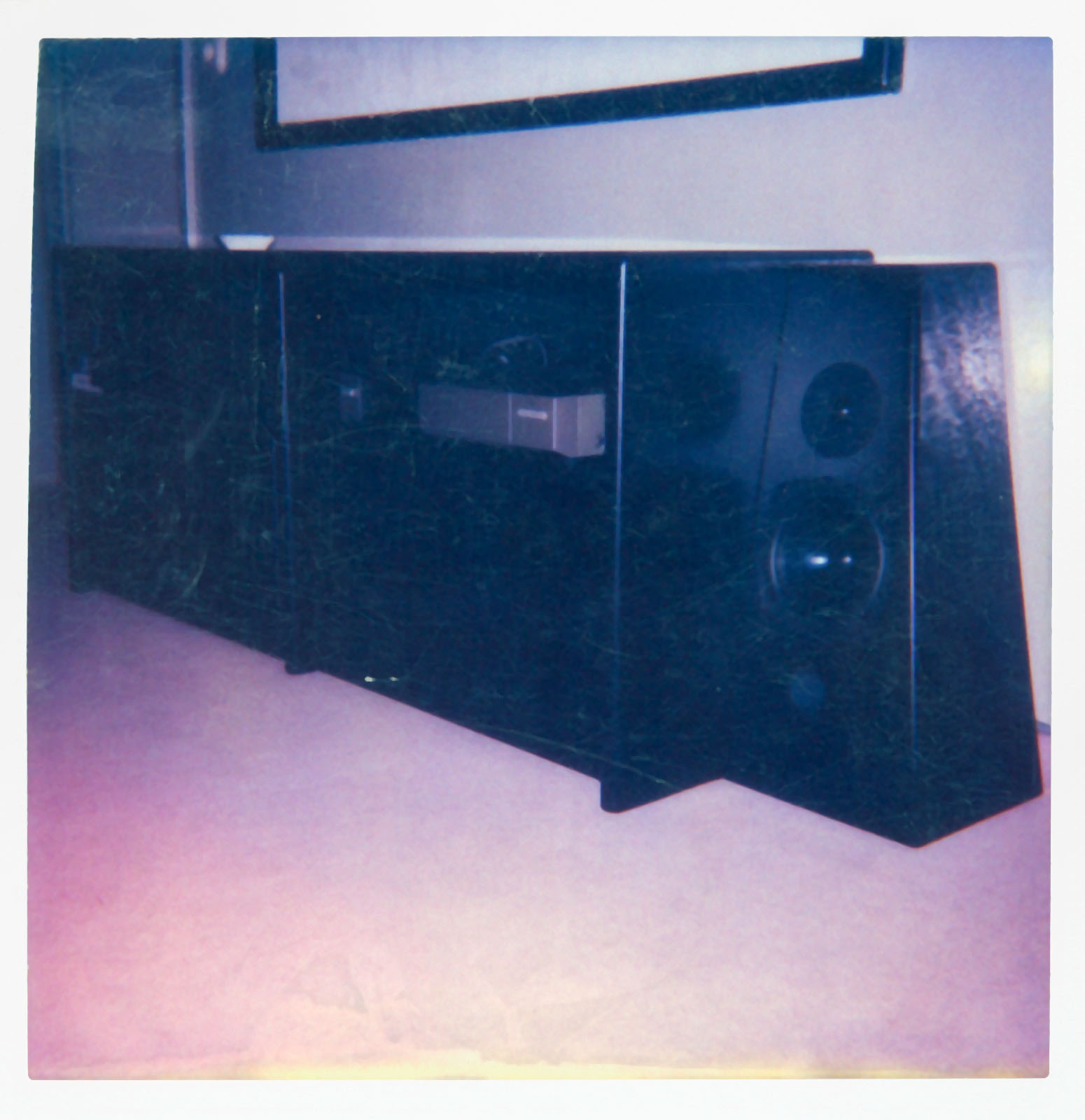 schwarzer Schleiflack - Plexiglas - Spiegel und "angelehnte" Boxen, Couchtisch mit dem darin eingebauten RGB-SONY-Projektor VPH 722QM und Videoleinwand